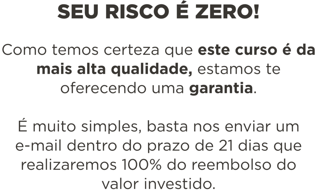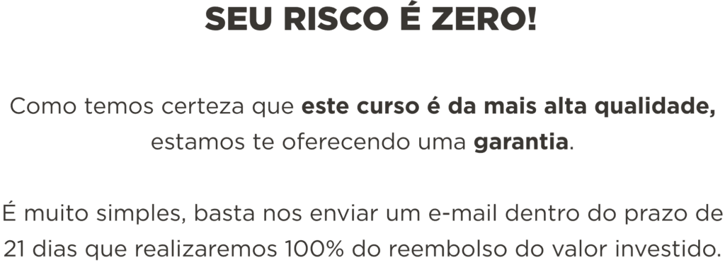 Sim! Confiamos tanto na qualidade do nosso conteúdo e da nossa entrega que caso oferecemos garantia de 21 dias, ou seja, caso você não goste ou aplique tudo que foi ensinado e não tenha resultados, devolvemos 100% do valor investido no treinamento.